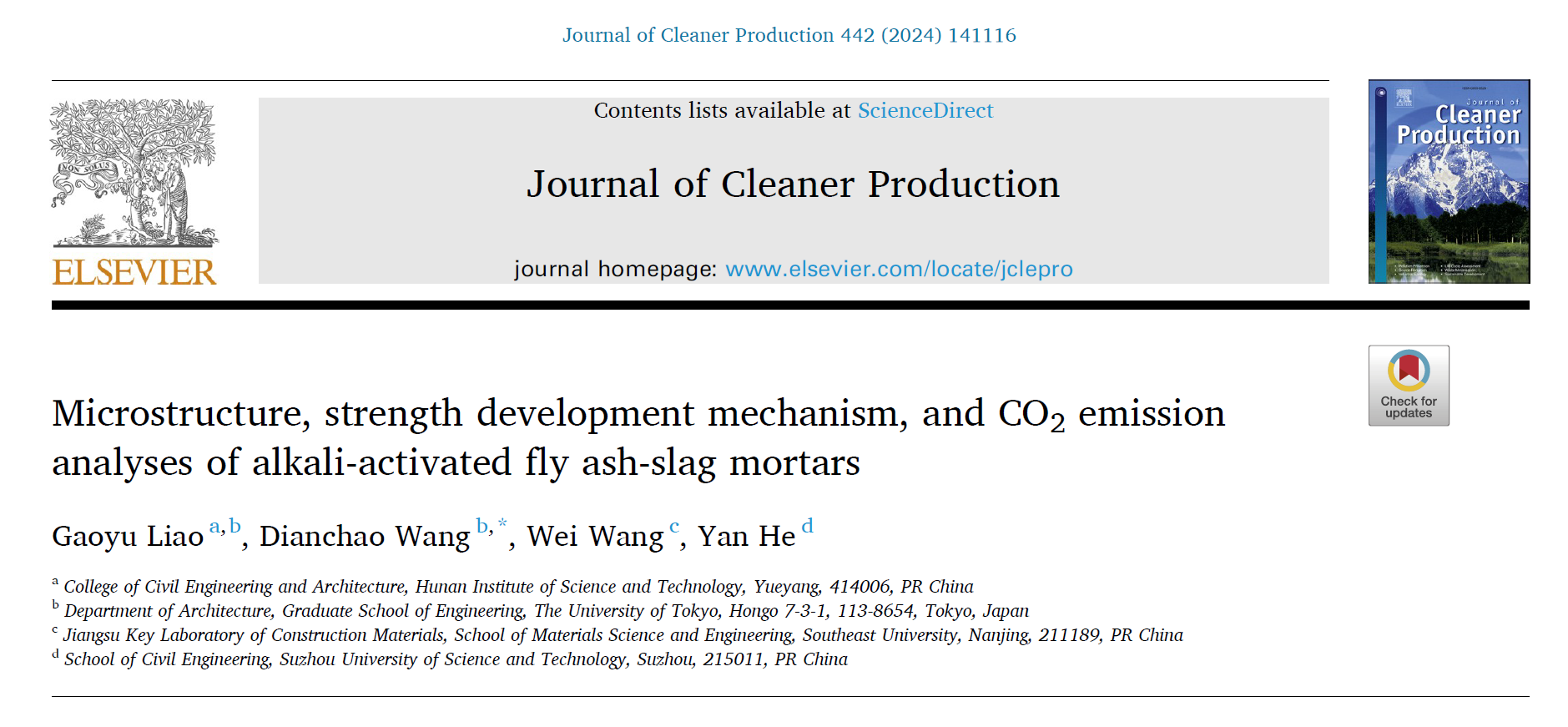 近日,我院青年教师廖高宇博士与东京大学王佃超助理教授等组成的研究团队,在国际环境与可持续发展领域权威期刊《Journal of Cleaner Production》(中科院一区TOP期刊,影响因子11.1)发表了题为《Microstructure, strength development mechanism, and CO₂ emission analyses of alkali-activated fly ash-slag mortars》的高水平研究论文(DOI:10.1016/j.jclepro.2024.141116)。该论文以湖南理工学院为第一完成单位,廖高宇博士为第一作者,现已被科睿唯安(Clarivate)收录为ESI高被引论文(1%),展现了我校在低碳建材与固废资源化利用研究方面的持续进展与国际认可。