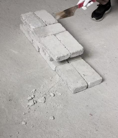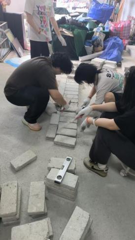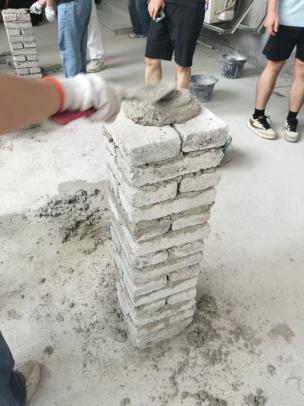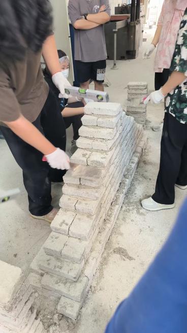 起初,砖柱会摞歪成“波浪墙”。而又一次的砌墙练习,掌握了基本要领的同学们,都砌出了完美的竖直的墙体。