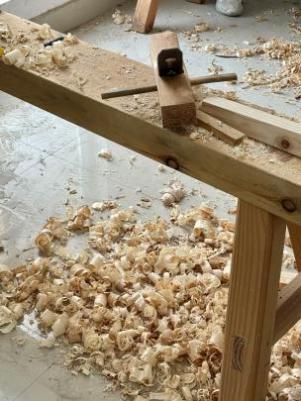 木工程师傅用框锯、刨子等木工工具亲自向同学们演示锯木头、刨光等制作过程及注意事项。随后,5个小组便摩拳擦掌进行选料,开启一场“木料大变身”之旅。