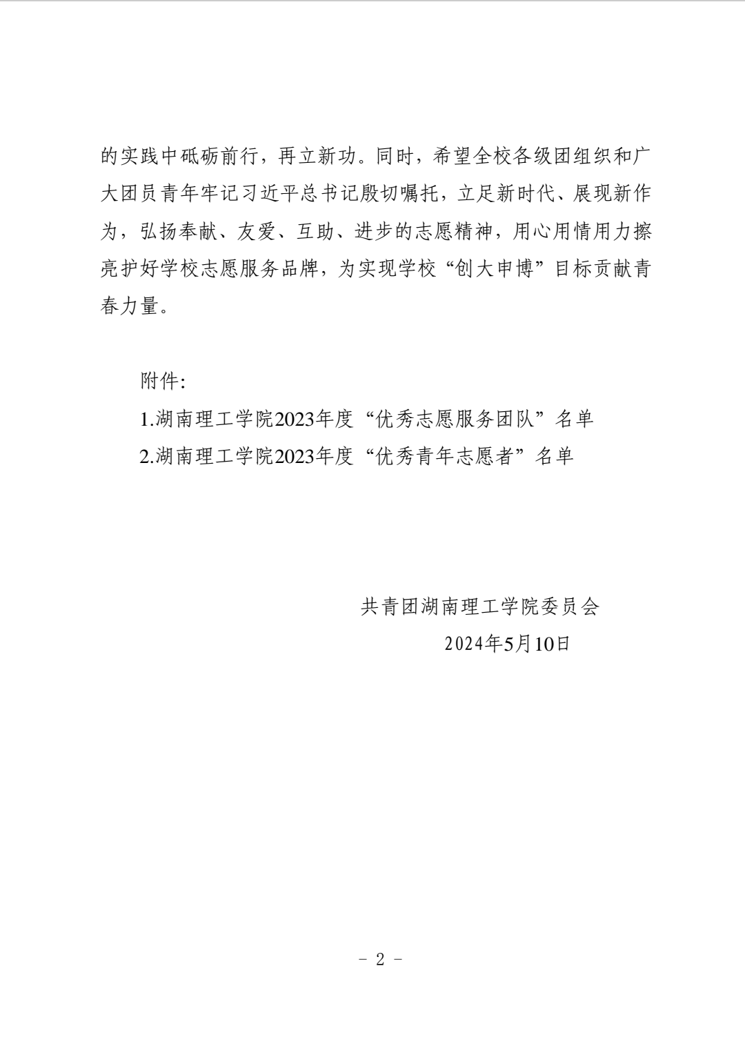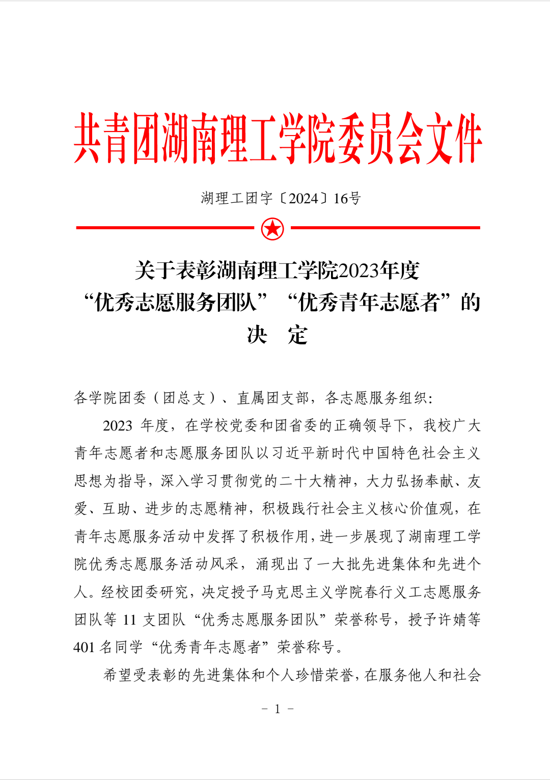 2023 年度,在学校党委和团省委的正确领导下,我校广大青年志愿者和志愿服务团队以习近平新时代中国特色社会主义思想为指导,深入学习贯彻党的二十大精神,大力弘扬奉献、友爱、互助、进步的志愿精神,积极践行社会主义核心价值观,在青年志愿服务活动中发挥了积极作用,进一步展现了湖南理工学院优秀志愿服务活动风采,涌现出了一大批先进集体和先进个人。经校团委研究,决定授予马克思主义学院春行义工志愿服务团队等 11 支团队“优秀志愿服务团队”荣誉称号,授予许婧等401 名同学“优秀青年志愿者”荣誉称号。