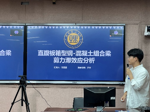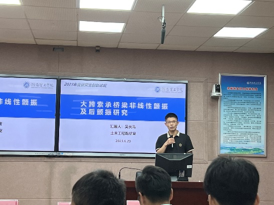 随后,潘仁胜博士与吴长青博士分别就“预制拼装UHPC 桥梁键齿接缝直剪性能研究”及“大跨度桥梁非线性颤振及后颤振研究”开展演讲,具体分析结构UHPC材料直剪性能、一体化气动时域模型等一系列研究内容。最后,学生抽签上台依次进行学术汇报,在接受评委点评及打分后得出成绩与最终获奖名次。
