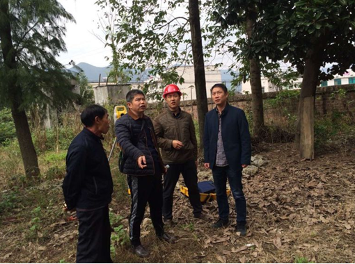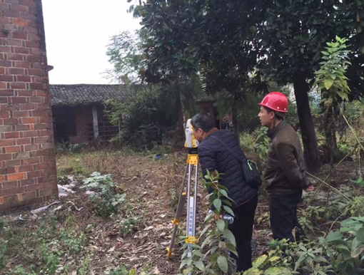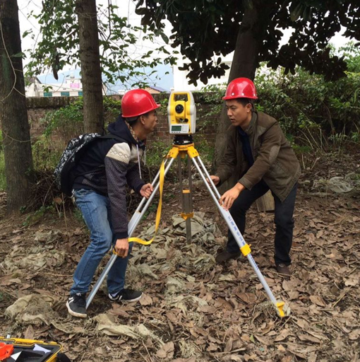 架起全站仪,掏出皮尺,师生三人齐上阵,在村支书的指导下开始了测量工作。朱诗敏站在仪器前,不断地变换角度,郭云峰负责做记录,肖肆喜则负责复核测量结果。时间悄悄地走,测量工作还在继续,只听一连串的数字不断地从朱诗敏的嘴里报出,郭云峰手下不停,一支笔舞得虎虎生风,赶紧将重要的数据正确地记录下来。村支书也在现场,“手舞足蹈”的,告诉他们一些工作细节。