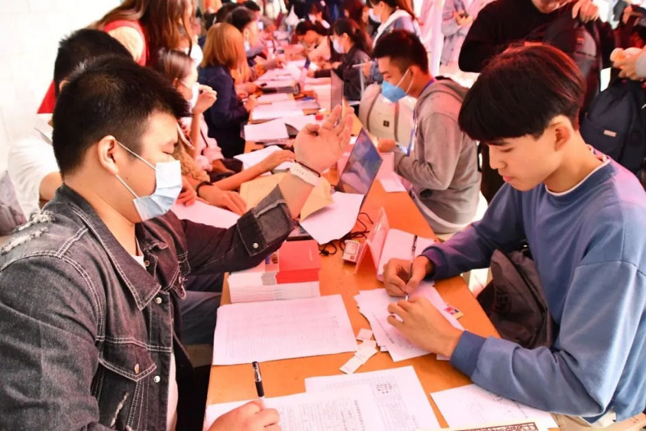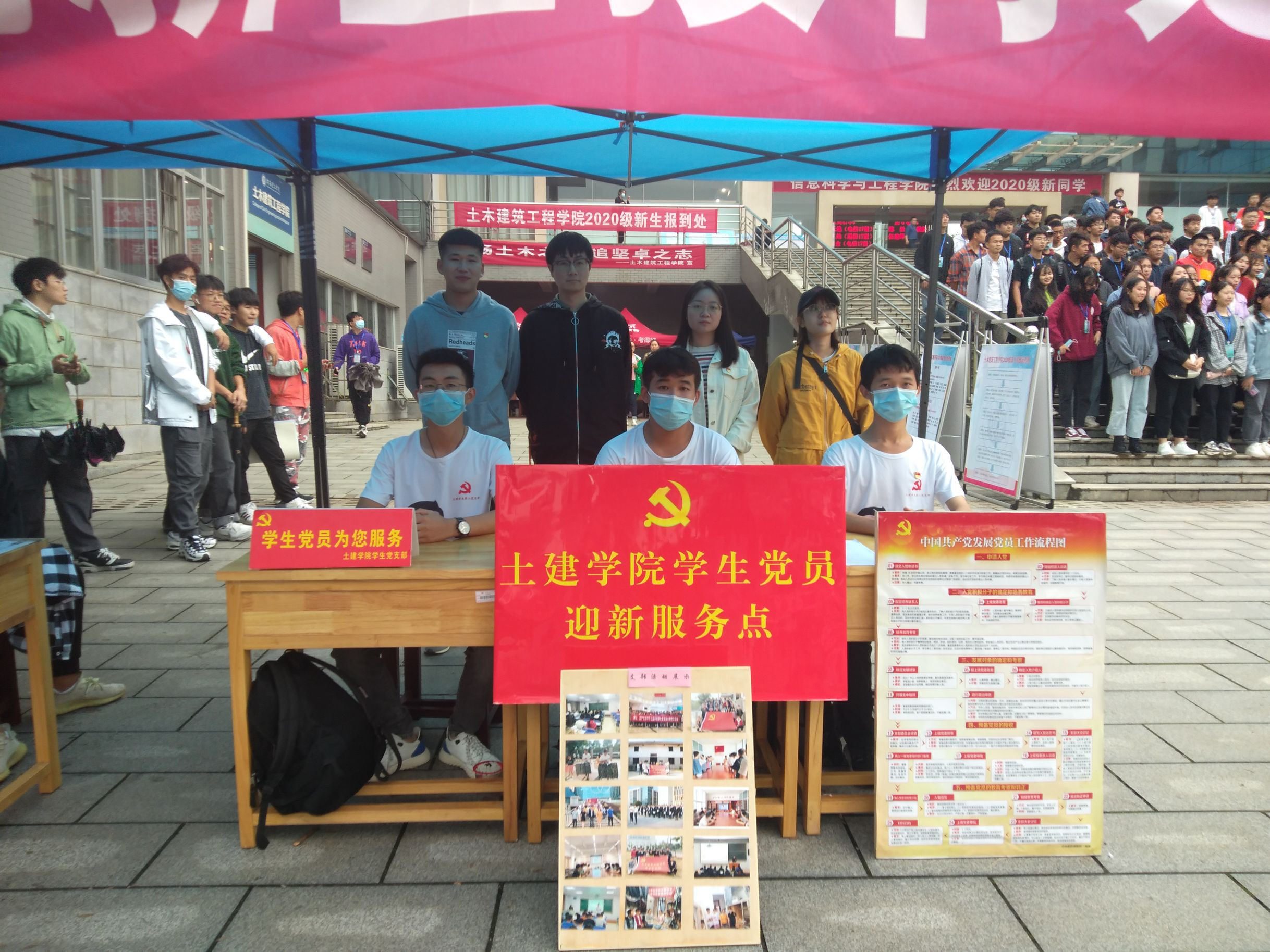 随后,陆陆续续到来的新生,让报道现场逐渐热闹起来了。助班和志愿者们耐心引导新生完成入学登记和注册等相关手续。9月的细雨带来一丝微凉,但学生们仍然热情高涨。为确保迎新工作顺利开展,超越工作室和学生党支部也成立了迎新服务台,志愿者们积极主动引导新生完成报到注册,耐心地为新生解答疑惑,本着全心全意为同学服务的宗旨,充分发挥出模范带头作用。报道现场人山人海,但一切都是那么的秩序井然。
