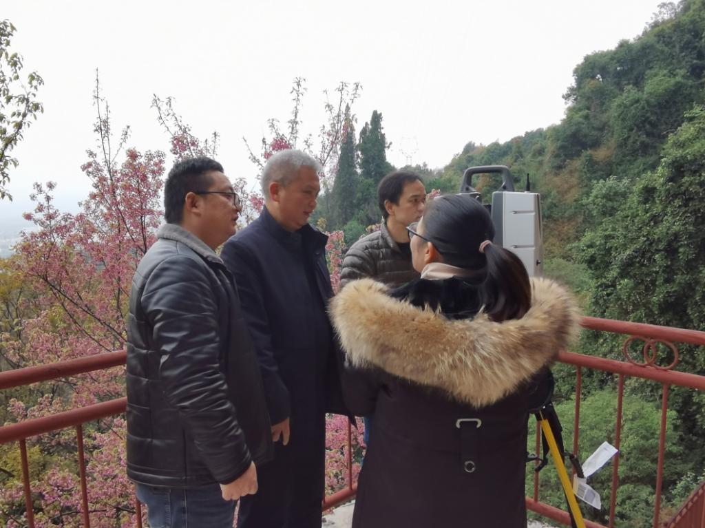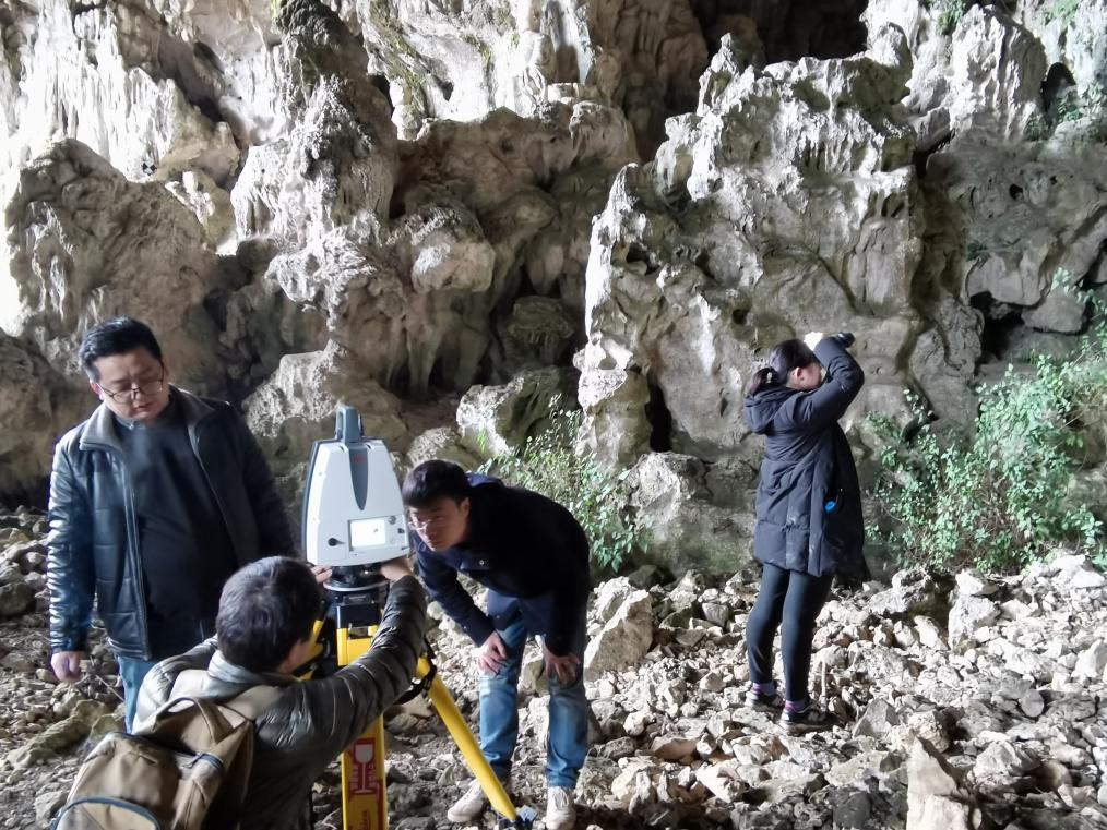 法华寺石窟前利用三维激光扫描仪收集数据