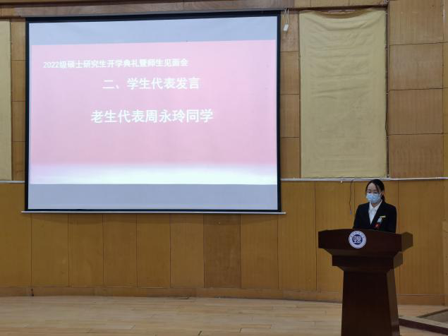 会议伊始,全体师生起立,奏唱国歌。22级研究生新生代表戴雨婷与21级研究生老生代表周永玲先后发言,在分享个人感悟和体会的同时,多角度叙述研究生应当注重自主学习与创新,积极探索、刻苦钻研,以实事求是的态度追求真理。