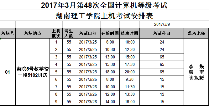 2.2017年3月全国计算机等级考试监考安排表